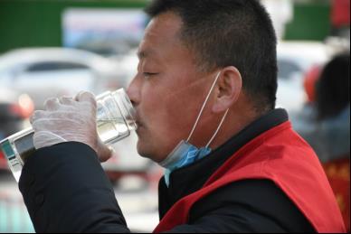 这张照片是省派泰安市泰山学院工作组服务点高新区奥林匹克花园社区一名叫杨晓的志愿者无意间拍的一张照片。照片中的人叫江彬,同样也是该社区的一名普通志愿者,他从2月12日起到现在每天从早上7点到晚上11点在社区大门口坚持志愿值班。这张照片在他们社区微信群内广为流传,江彬被大家笑称为“喝水哥”。我们工作组看到这张照片时被深深震撼,给照片上作了如下评论: