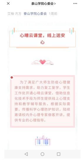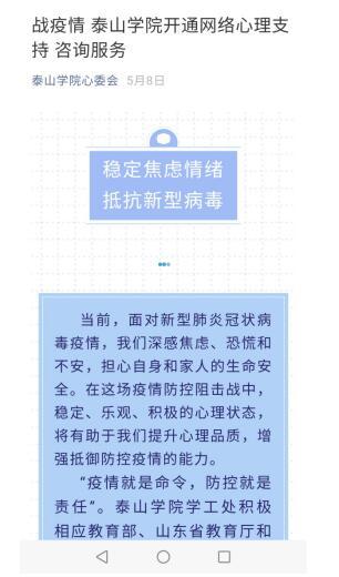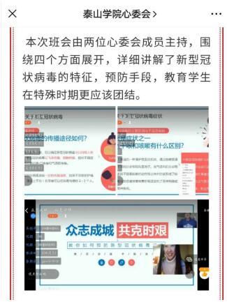 学校还打造学生喜爱的线上心理健康教育平台。“泰山学院心委会”公众号,每天推送“战疫情”心理推文,传播疫情防控知识和情绪与压力管理的相关知识与方法;积极开展线上朋辈心理辅导活动;疫情期间开展了11期战“疫”云班会、心理健康教育学生骨干培训等活动;录制了“中国加油!武汉加油!”的祝福视频;开展“云”家访活动,对心理预警学生进行了及时回访,对学生和家长进行暖心回访和有效的心理指导干预。
